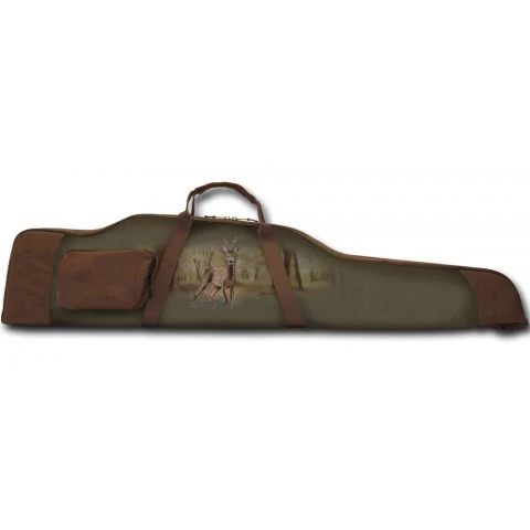Speciális dekoratív nyomat. Külső nagy textilbőr oldalzseb.Tökéletes védelem távcsöves fegyverek részére. Koptatott textilbőr erősítésekkel.